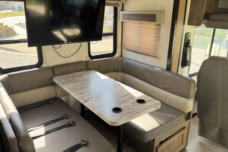 Turn the Driver and Passenger Swivel-Seats around, add three Lawn Chairs and you have a group setting for TWELVE people to have a blast together, eating, playing games, and watching a flick on the wall-mounted flat screen.