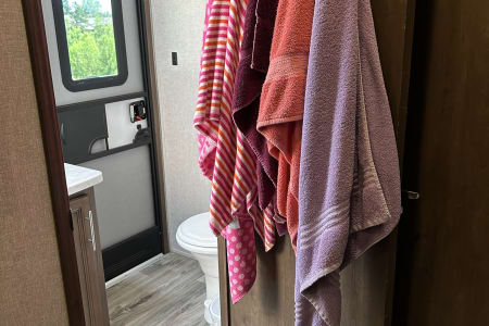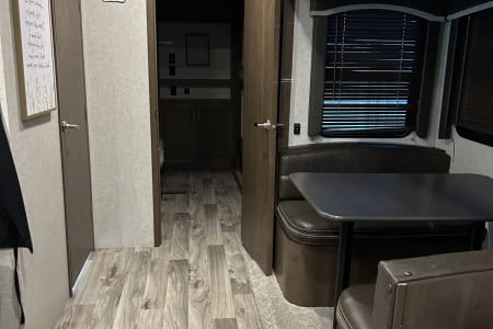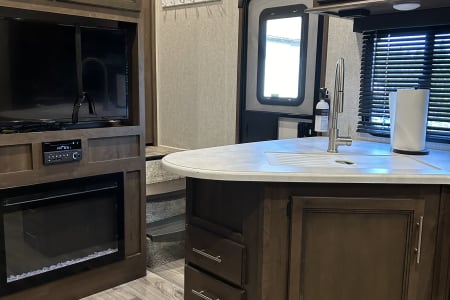 Get away with the fam in this 5th wheel with bunkhouse. Auto leveling jacks make it easy to set up quickly and start adventuring. This RV has everything you need to get into the great outdoors. Just bring your clothes and food and you are all set. The bunkhouse has a couch that converts to a bed as a hangout place for the kids in less than stellar weather conditions. The master bedroom has a half bath, while the main bathroom is a full bath with a bathtub and shower combo. The outdoor kitchen complete with sink and fridge/freezer combo is so nice for grilling outside with the included 22" blackstone. There is plenty of storage inside and under the RV. On a chilly night you can enjoy the cozy fireplace and play a boardgame inside.