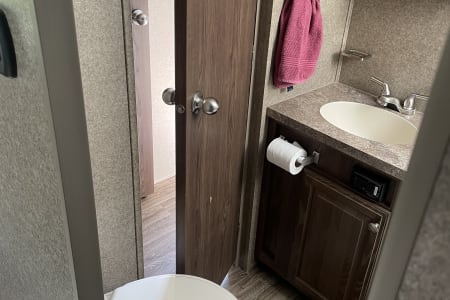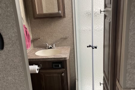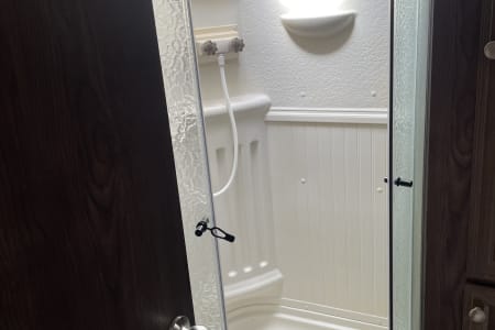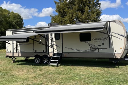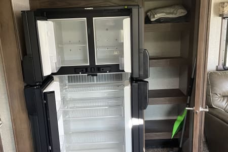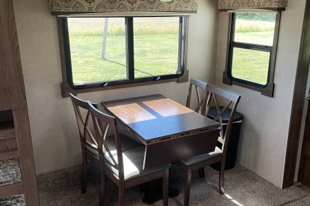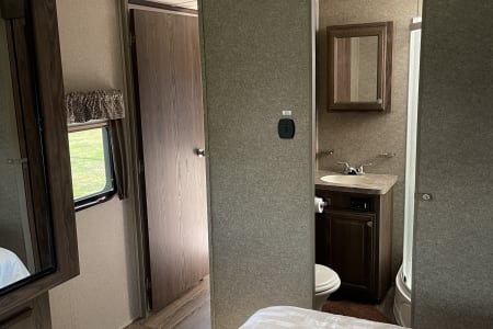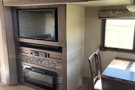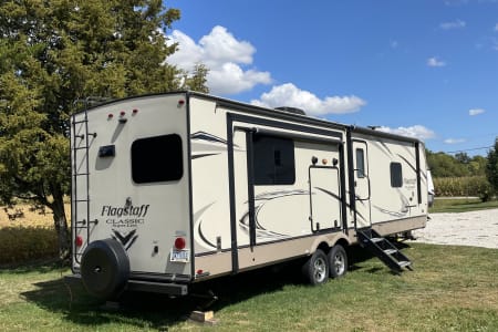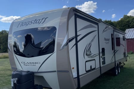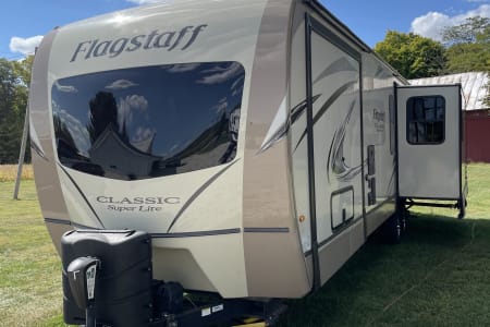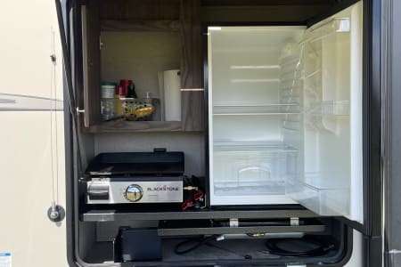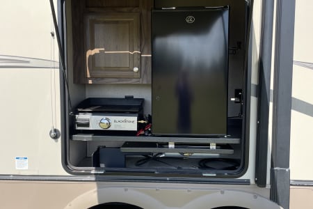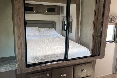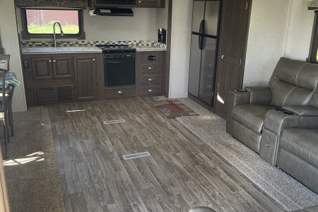 Spacious and comfortable. One main bedroom with queen size bed. Perfect for a couples retreat or the option to accomodate an additional guest with pull out sofa bed in the living room. Very modern with full size fridge and plenty of countertop and cupboard space and bonus pantry for additional storage. Cozy living area with double reclining loveseat and sofa seating. Outdoor kitchen features the convenience of a pull out gas grill and fridge while the dual extendable awnings protects you from the elements so you can relax and enjoy the outdoors in comfort.