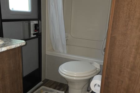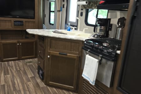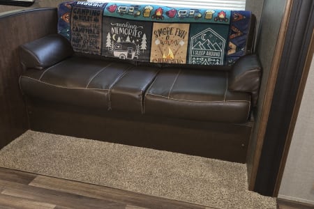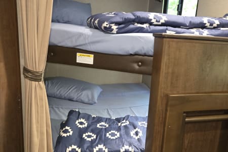 Enjoy our family ready camper. We have equipped this 27 foot bunkhouse camper with everything to have a great trip with your family. Clean bedding, pillows and towels for your stay and basic toiletries in the bathroom. Outdoor chairs and rug create nice outdoor space. The Kitchen is equipped with pot, pans, utensils and dinnerware and automatic coffee pot. Full size bunks, a Queen in the front provide for a great nights rest after a day in the outdoors. The dinette and sofa also fold down to make beds, we recommend these for small kids or fur babies. Add on the Blackstone and fire wood to complete your adventure.