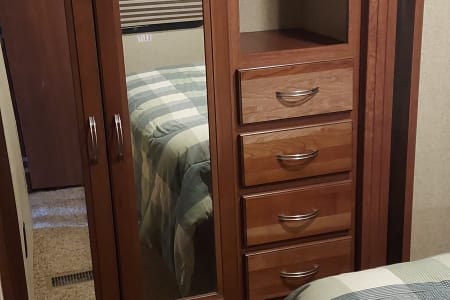 Forest River Wildcat 33foot. Bunk house with out door kitchen. Outdoor kitchen comes with a Bar-B-Q grill, stove top, sink, tv, 120V refridgerator, and camp chairs. Bunk house has 4 beds, 72 inches long, 28 inches wide. Dinnette makes a bed, Queen bed up top, with pillow top mattress. Linens included if you want them or bring your own. Kitchen has, plates, bowls, silverware, cooking utensils, skillets, pots, coffee cups, coffee maker, and some spices. Continuous hot water heater.