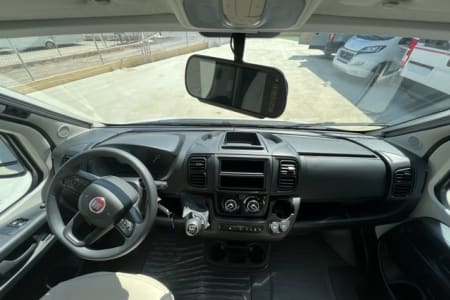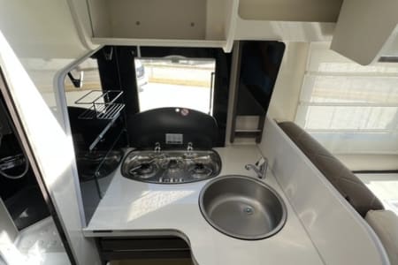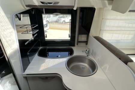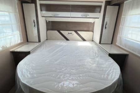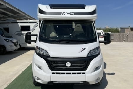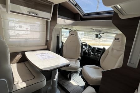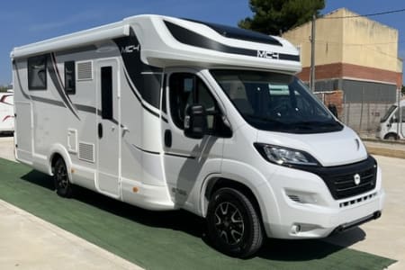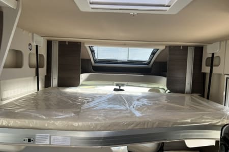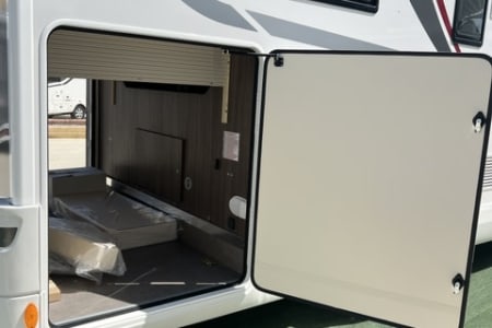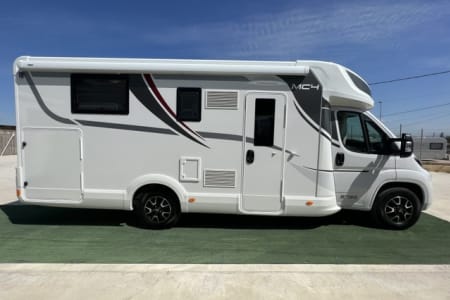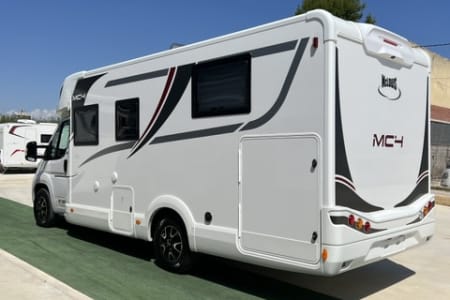 Autocaravana perfilada con cama isla trasera y abatible en el salón. Dispone un amplio garaje en el que caben bicicletas y todo lo necesario para tus vacaciones. Las medidas de las camas son: 140x190 y 130x190. Esta AC dispone de aire acondicionado en la cabina y en el habitáculo cuando el vehículo está parado. Dispone también de toldo exterior, TV, Dúo Control, equipo multimedia con retrocámara y enchufes USB para conectar los móviles.