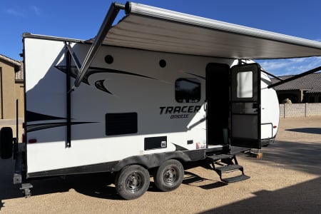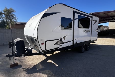 Hit the road in style with our 2018 Prime Time Tracer Breeze 19MRB – the perfect travel trailer for couples or small families looking for adventure! This ultra-lightweight 4,300 lb trailer is towable by most SUVs and half-ton trucks, making it an easy choice for both new and experienced RVers.