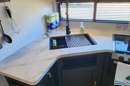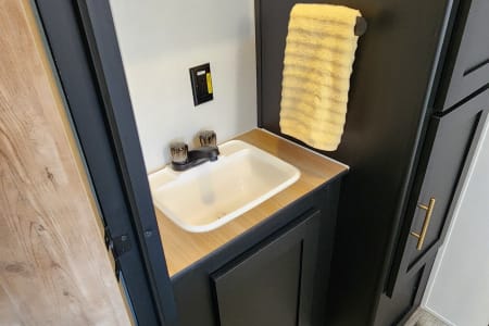 Private Bathroom: Enjoy the convenience of a private bathroom with a shower, toilet, and vanity—no more campground bathrooms! There's also an outdoor shower- perfect for rinsing of sand!