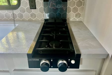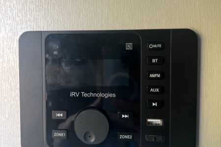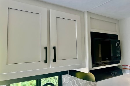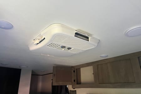 The kitchen has a large deep sink, two burner cooktop with exhaust fan, microwave and very large fridge w/separate large freezer. Closet w/rod for hanging items plus generous cabinets and under bed storage areas. Great for tall folks with 6’2” interior ceilings. Outdoor speakers, LED lights and power awning for relaxing and watching sunsets.