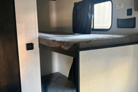 Chase sleeps 5-6 with 2 in a queen bed w/privacy curtain, 2 bunks and a dinette/bed conversion for 1 smaller adult or 2 little ones. A 13,000 BTU AC, furnace, hot water heater and full bathroom keep you comfortable.