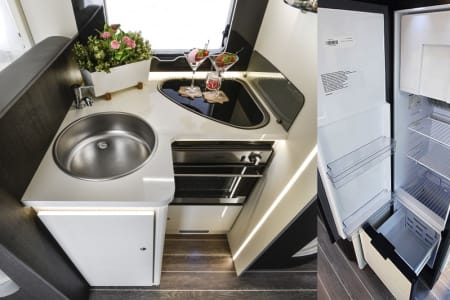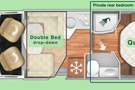 This luxurious four-berth motorhome features a rear island bed, complete with bedside tables and two wardrobes, ensuring ultimate comfort and convenience. The drop-down bed, easily stowed away during the day, maximises space for relaxation and entertainment. The popular L-shaped lounge provides seating for up to five people, making it ideal for family meals and quality time together.