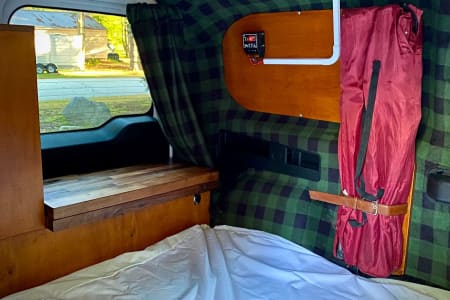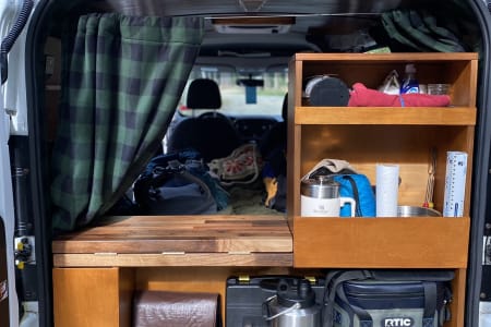 There is enough headroom to sit upright on the bed! This is important when you need space to change clothes, escape the rain, or play a game inside. Your bags can be stored on the front seats when sleeping. The rear kitchen cabinet has everything you need to cook with. A butcher block counter folds out to make a small kitchen counter.