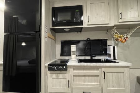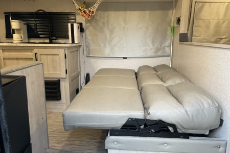 With a king size bed, and room for up to 6 more people (5 beds total), this is the perfect trailer for your travels! It has a smart TV, DVDs, board games, and outdoor folding chairs, so you can relax or play! It has a roomy fridge and freezer, a keurig with some pods included, and everything you need to cook and eat nice meals, including a propane stovetop, crockpot, and microwave. We include pots, pans, utensils, plates, bowls, and cups, as well as some basic seasons. There are toiletries available, as well as towels, and washcloths so you can feel clean and comfortable. Blankets and pillows are also included.