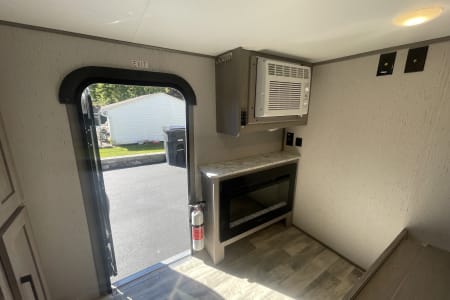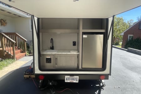 Make camp with the rear kitchen in the back, has a 21 gallon water tank and a matching grey water tank & a compact fridge with a small freezer compartment. Has a propane power grill that mounts to the side of the camper.