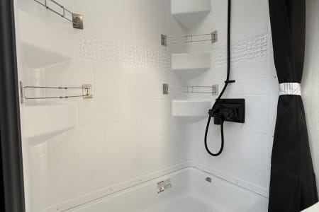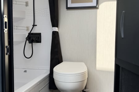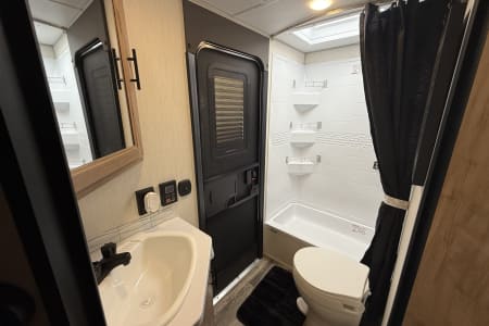The private master suite boasts a comfortable camper king-sized bed, with under-bed storage, dual nightstands, and overhead cabinets, ensuring a restful night’s sleep. The bathroom offers a spacious shower, vanity with storage, and upgraded fixtures that make you feel right at home.