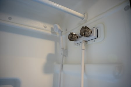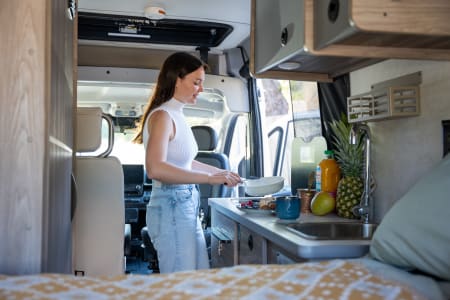 The van comes with a two-burner stove, sink, and fridge, along with a full cookware set for convenient cooking. It includes an indoor shower and toilet, plus an outdoor shower for added flexibility.