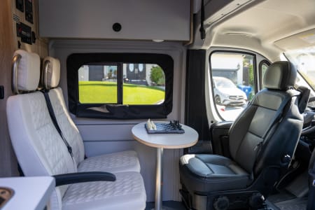 A spacious double bed provides comfort for two, while the rooftop pop-up bed offers an unforgettable stargazing experience. The seating area can also be converted into an extra sleeping space with an inflatable mattress.
