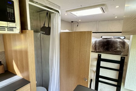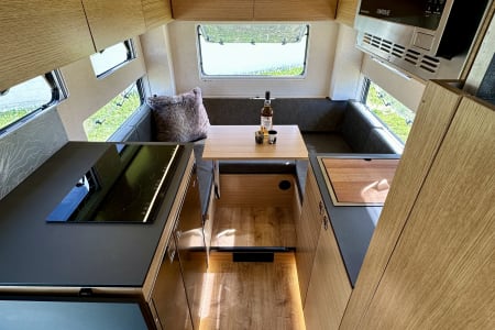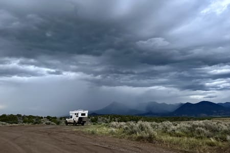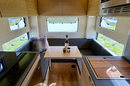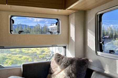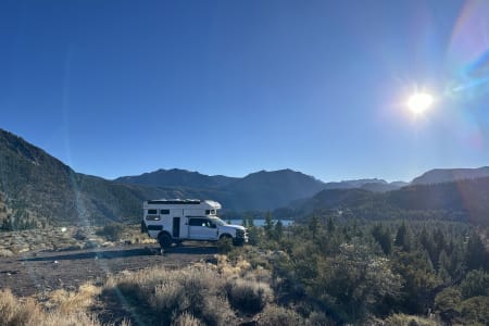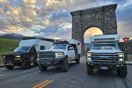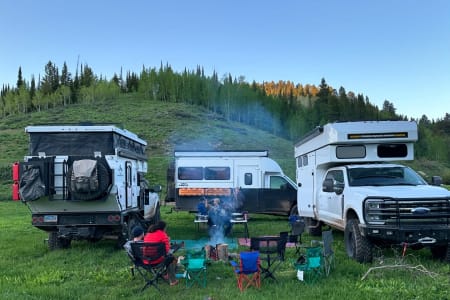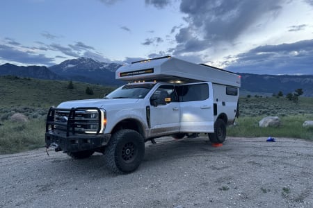 This Rossmonster is built on a Ford F350 chassis with all the bells and whistles. The truck offers comfortable seating for 4 in the cab, contains a queen size bed over the truck cab w/ custom memory foam mattress, a leather dinette/bed conversion that sleeps 2 adults, dual heat options with heated floors, an interior enclosed shower and cassette toilet, a full galley with fridge/freezer, induction cooktop, residential size sink, and microwave/convection oven combo. The 60 gallon fresh water tank feeds the interior sink, interior shower and exterior shower, there is an AquaHot hydronic heat/hot water system, 800 watt solar array, inverter & outlets to charge devices, an upgraded lithium ion battery bank, hydraulic lifted roof, and so much more!