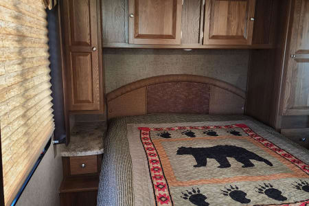Back bedroom includes queen size bed, full slide-out closet, storage cabinets around bed, TV, and dual-access entry into the full sized bathroom.