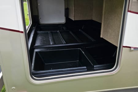 You'll love the custom red exterior paint. The awning with LED lighting provides plenty of cover from rain and rays. Ample outdoor storage means less limitation on what you can bring! There is even an outdoor TV for those days when you want to catch the big game, but it's just too nice to go indoors! 4 comfy outdoor chairs are included.