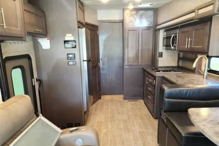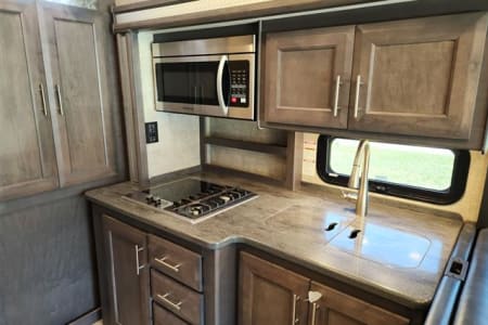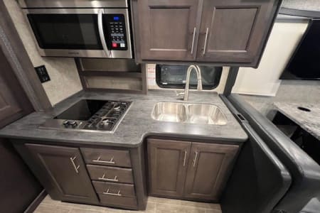 Kitchen equipped with a dual basin sink, fridge/freezer convection microwave, 2 burner propane cook top and single burner induction cook top