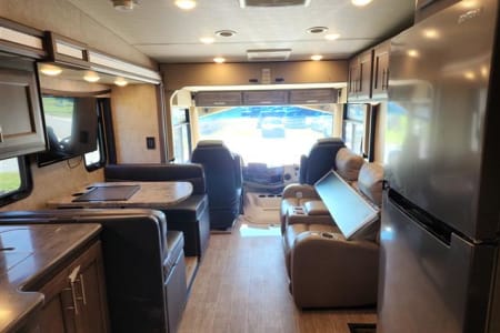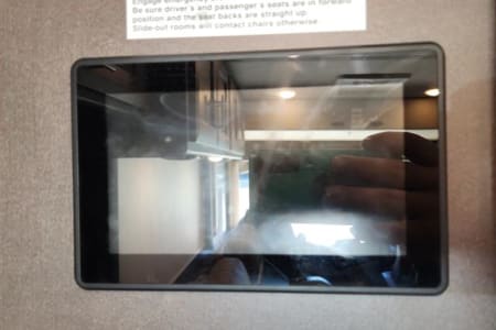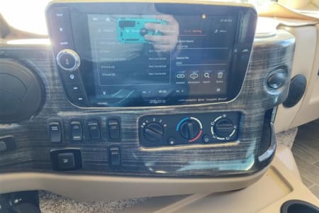 Cab area equipped with large touchscreen radio, back up camera, blind spot cameras