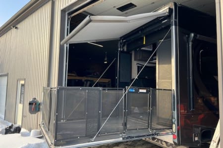 Rear ramp for loading that also doubles as a gated party deck with its own awning