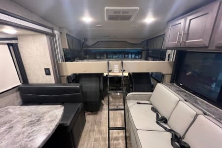 Sleep up to 12 with 6 separate beds. Fold out sofa, fold down dinette. Master bedroom with a king bed. 2 separate fold out couches and a large loft bunk in the toy hauler area