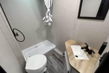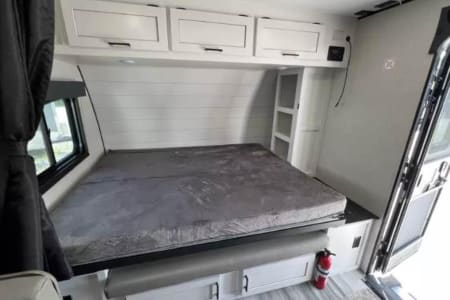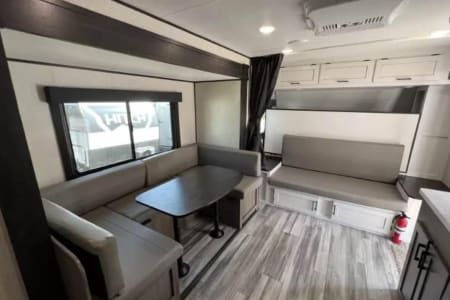This brand new 2024 camper won't disappoint. It is compact but still has space for the whole family. It features 2 full sized bunks in the rear, a queen murphy bed at the front, and stadium dining that converts to a full size bed. It is also equipped with a large fridge/freezer, stove top, and microwave. Outside you have a mini fridge and outdoor griddle perfect for a breakfast in the woods.