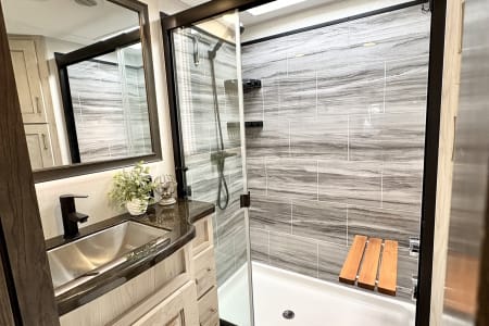 There is one full bathroom in this unit with a toilet, sink, and an amazing shower!