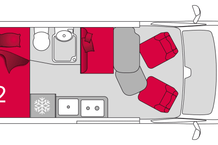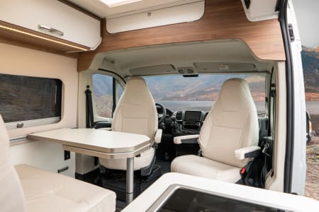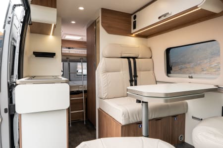 Vous bénéficierez d’un grand espace salon où vous pourrez vous installer confortablement à 4 personnes, grâce à la large banquette arrière et aux deux fauteuils cabine pivotant. Des ports USB et une prise 230V sont facilement accessibles pour vous permettre de recharger vos appareils électriques. La table, installée sur rails se glisse pour laisser plus de place d’un côté et de l’autre.