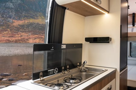 La cuisine est conçue pour vous permettre de cuisiner avec aisance. Sa plaque de cuisson est à 2 feux à allumage piezzo et un couvercle d’évier permet d’agrandir le plan de travail, tout comme la rallonge installée à l’extrémité du meuble.