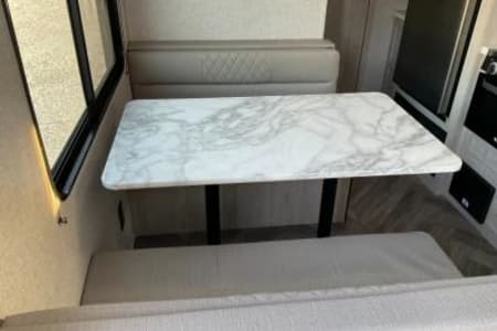 The interior offers comfort and convenience throughout with an 81" ceiling height, night shades, a sound system with Bluetooth & HDMI connectivity, and an extra large dinette picture window for great views, sleeps up to 6.