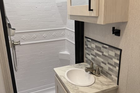 There is one queen bed in the master bedroom, a bed over the cab, and a convertible dinette and sofa. The toilet is separate from the shower which makes it super convenient for everyone. There is a beautiful stove if you prefer to cook indoors, which is well equipped with everything you need to make a delicious meal. There is also a convection/microwave oven and full-size refrigerator so you will have plenty of space to store your food and drinks.
