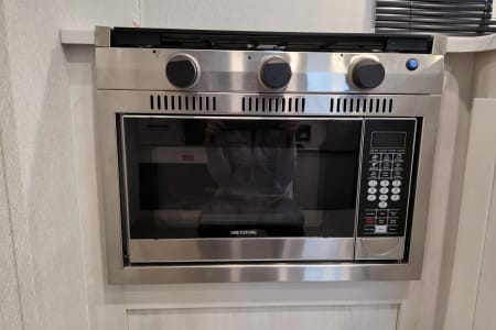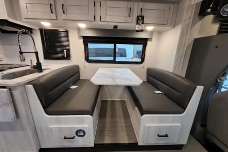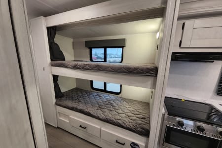 This Entrada Class C gas motorhome has quite a lot of class and comfort! Every inch of this coach has added living space because of the full-wall slide on the driver's side, and this slide adds extra room for additions like the bunk beds. Not only is there a set of bunks on the slide, but there is also a bunk above the cab if someone else wants to spend the night on a bunk bed. You will have a great night's rest on the queen bed in the rear master suite, and since this bedroom gives you a private entrance into the dual-entry bathroom, you won't have to go far in the middle of the night. This coach also has great entertainment with a 40" 12V LED Swing Arm TV over the cab, and there is a space prepped in the bedroom if you decide to add another.
