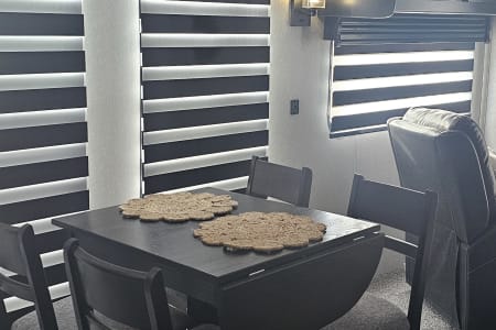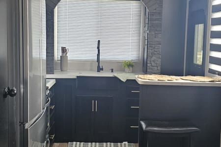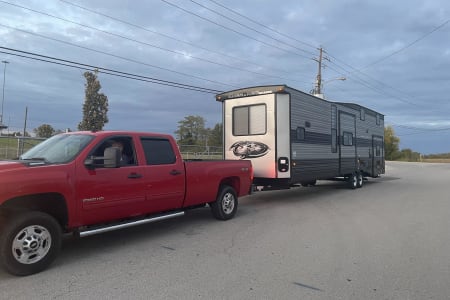 With all the amenities of home, pack up, and enjoy the great outdoors in our very spacious 39-foot travel trailer. We have sought to equip our travel trailer with everything you might need for your adventure. This travel trailer will sleep 6-8 people, boasts a large living room with 2 sofa beds and a recliner, has an additional sleeping quarter in the upstairs area, and a nice kitchen with a large fridge and pantry. The main, private, bedroom is at the back of the trailer and has its own exit door. You will surely love the full-size shower, and the electric fireplace. With tons of storage, all this travel trailer needs is YOU! You will not be disappointed! Camper requires a 50 amp service.