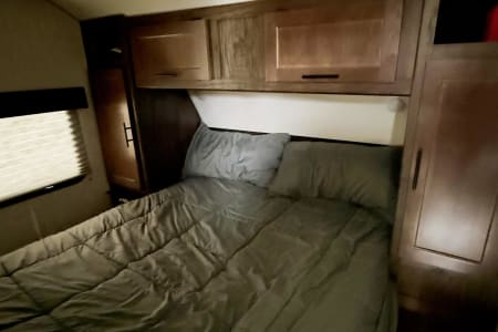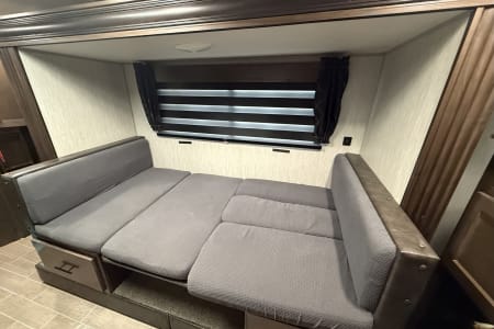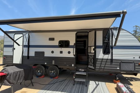 The trailer comfortably accommodates up to 8 individuals and includes all essential amenities. It features one bedroom with doors and a queen-size bed, double-sized bunk beds, and a dinette that converts into a full-size bed. The kitchen is equipped with a refrigerator, freezer, stove, microwave, and an air conditioner with ducts throughout the trailer. Electric fireplace that adds to the ambiance when it is cold outside. Additionally, it has two outdoor doors, one leading to the main living area and one to the bathroom. The trailer has fresh water, black, and grey tanks, as well as one slide-out that provides ample space inside. It also includes both outdoor and indoor bluetooth sound system, outdoor lights, and an outdoor shower.