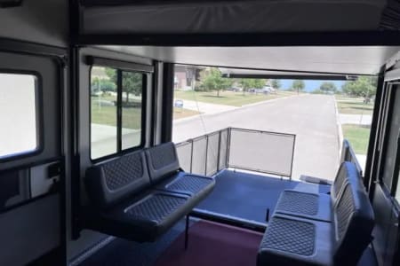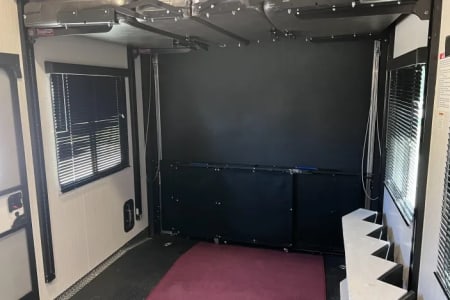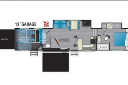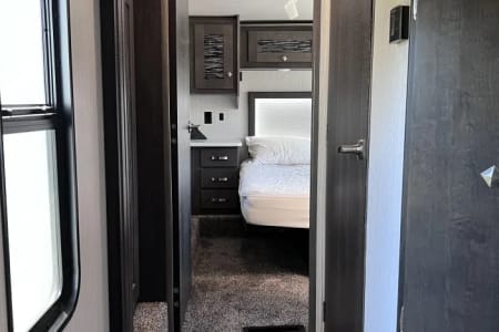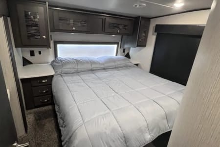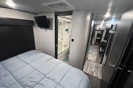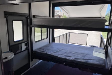 And when it's time to get some sleep, head to the front bedroom with plenty of storage and space thanks to the two slide outs. The Sleep Number California king bed will provide you space just like at home. In addition to the twin-size bunk bed overlooking the living room, the “garage” has 2 queen beds.