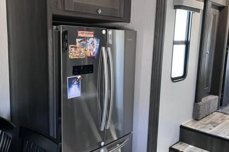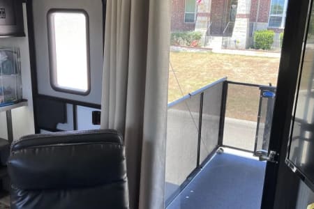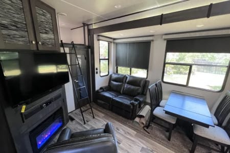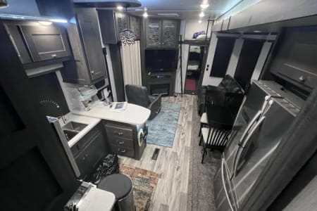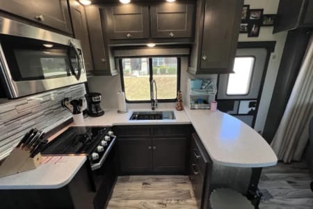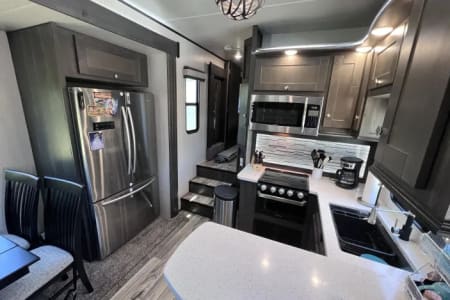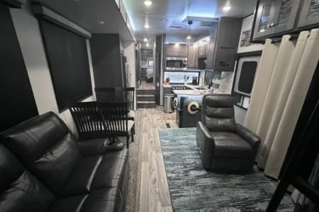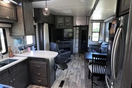 Now imagine the main area and kitchen with a slide out for more interior space, a comfortable dual recliner sofa, a separate, standalone swivel recliner and a bench with a table for dining. Three built-in bar stools allow you to visit with the cook making a warm meal in the convection microwave and store leftovers in the 18 cu. ft. refrigerator.