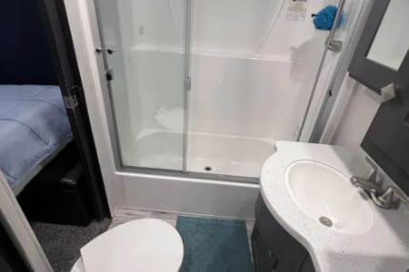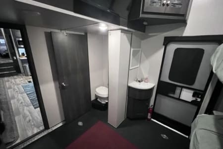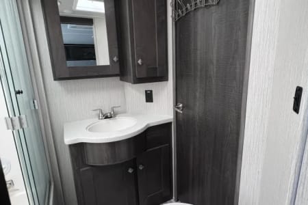 Rest comes easy in this Road Warrior; the bathroom boasts heat and air ducted bath, a bath skylight, and a porcelain toilet, adding a touch of elegance to your daily routine.