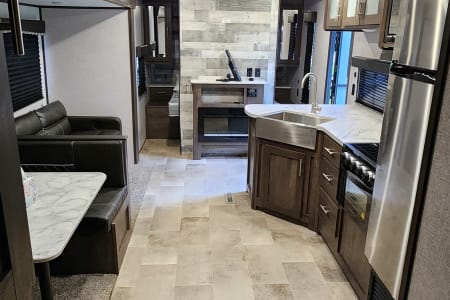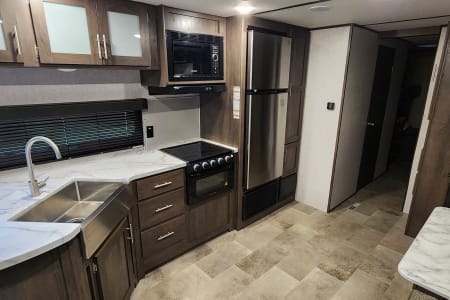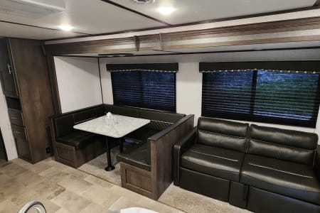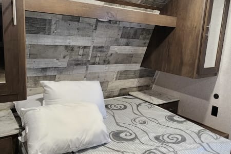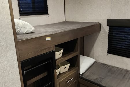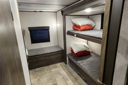 With bunk beds for the kiddos and a private master bedroom for the adults, everyone gets their own space to relax after a day of exploring the great outdoors. The full kitchen means you can whip up a delicious meal no matter where you are. And when the sun sets, gather around the outdoor campfire area for some stargazing and storytelling.