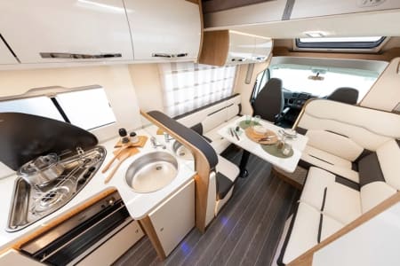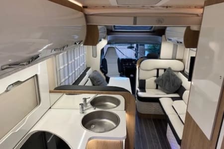 A large skylight above the cabin lets a large amount of natural light into the van. Couple this with 2 additional skylights and large windows either side of the dinette area you have an abundance of natural light in the daytime. However you are also spoilt for choice with lighting. There are literally lights EVERYWHERE! It can turn the inside of the motorhome to a lightbulb.