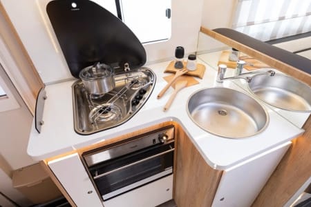 It has a Thetford Duplex oven/3 burner hob for all your cooking needs which runs from the LPG