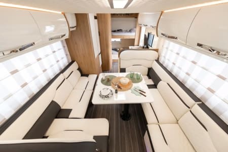 She sleeps up to 6 but the dining area is the last 2 beds so its more suited to small children only due to the fact of the narrowness of the seats. It suits better to 4 but 6 is possible if needed.