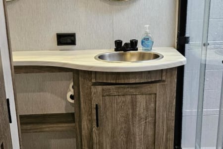 This salem elite has all you would need in an rv. King size upgraded mattress in the master a separate bathroom with full shower in the master bedroom. It has a half bath in the middle and sleeps 4 on the 2 pull out sofa queen beds. Has all the amenities inside and out. Inside a 65" smart tv. Stereo, fireplace. It has a full size residential refrigerator. It has a double sink in kitchen, 3 burner stove and oven. Microwave. Ice maker available as well. It has an outside pull out kitchen with a blackstone grill and outside tv. All items needed to camp are included in this rental. Large storage areas underneath as well as inside.