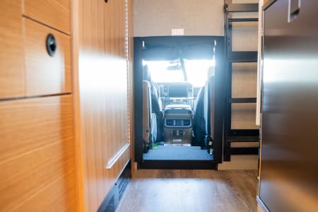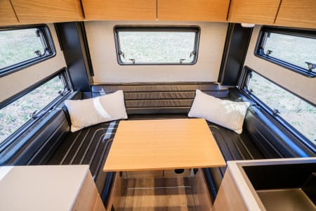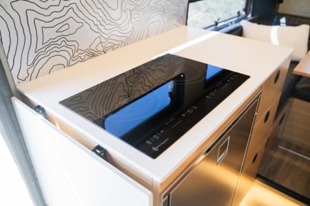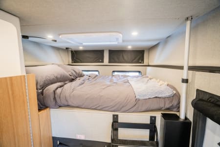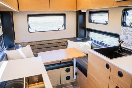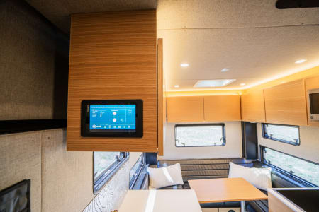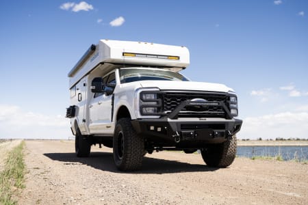 Built on a Ford F-350 chassis, this truck offers comfortable seating for 4 in the cab, contains a Queen size bed over truck cab w/ custom memory foam mattress, a leather dinette/bed conversion that sleeps 2 adult or two, a full galley with fridge/freezer combo, induction cooktop and residential size sink. The 30 gallon fresh water tank feeds the interior sink, interior shower and exterior shower, there is an AquaHot hydronic heat/hot water system, solar array, inverter & outlets to charge devices, and an upgraded lithium battery bank (and so much more!).