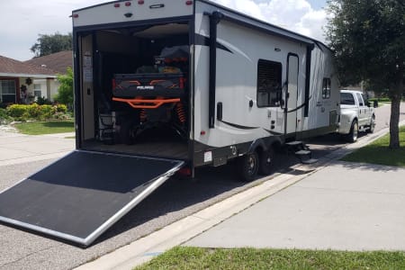 This highly functional toy hauler offers plenty of space for you to travel with your motorcycles, dirt bikes, golf cart, ATVs and kayaks. Enjoy a campsite, a stadium tailgate, or your favorite racetrack.