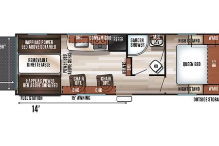 This toy hauler features a private master bedroom with a queen size bed. One queen size bunk bed and two sofas that convert into another queen size bed. It comfortably accommodates a party of 6.