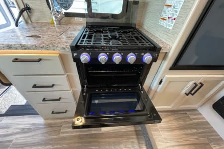 The corner L-shaped lounge converts to a cozy Queen-sized bed at the back of the RV, adjacent to the FULL BATH, which is complete with a toilet, sink, medicine cabinet, and shower with detachable shower-head. The kitchen is equipped with the rare RV OVEN, 03-burner gas stove, microwave, and kitchen sink with lift-countertop extension. The dream dinette just opposite the kitchen has seatbelts and can fit up to 04 people as a dinette and sleep up to 02 when turned into a 76” bed. Just above the cockpit is also a spacious cabin bunk, which can be slimmed down to ensure the driver and front passenger can easily access the back.