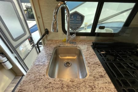 This motorhome is known for being easy and enjoyable to drive, and for holding plenty of people comfortably, making it perfect for road trips. You can sit approximately 04 people in the rear lounge, 04 across from each other at the dinette, and 02 in the front cockpit. Besides the wet storage below the camper, some additional cool features include a coffee maker, ref. with separate fridge & freezer, 02 smart TVs that can swivel out from their situated space to accommodate more viewers, A/C & heaters, a full-length power awning, and automatic stabilizing jacks.