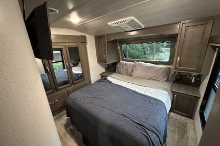 This Keystone Cougar 364BHL is the ultimate family camping camper. It has two separate bedrooms with a kitchen and living area in-between. Kids or guests have their own bathroom and entrance. Plenty of storage and closet space, and three TVs. Cook outdoors and enjoy your time spent under two awnings.