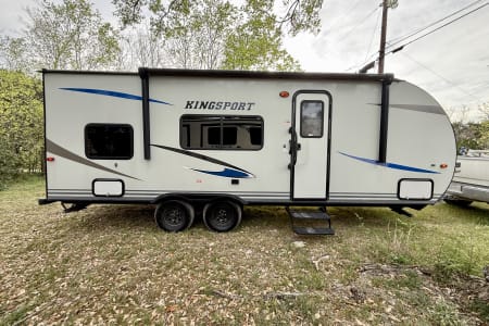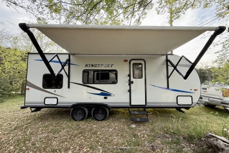 The private rear corner bathroom features a skylight over the tub and shower, letting in natural light, while the exterior pass-through storage gives you plenty of room for all your extra camping gear. Inside, the woodgrain vinyl flooring, laminated countertops, and LED lighting provide a stylish and modern atmosphere. The electric awning with LED lighting is perfect for relaxing outdoors after a day of adventure. Whether you’re planning a weekend getaway or an extended stay, the Kingsport Ultra Lite offers both comfort and convenience, so all you need to do is show up and enjoy!