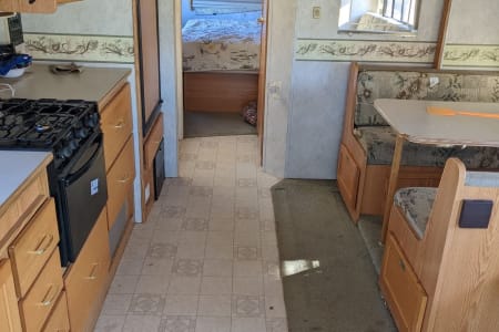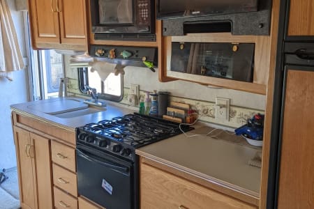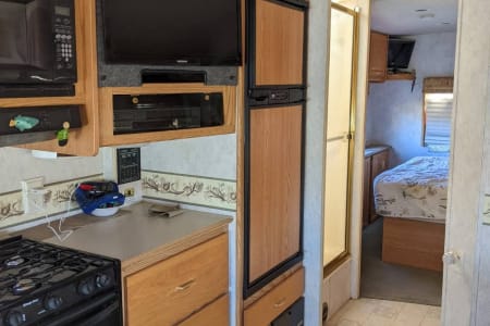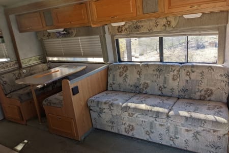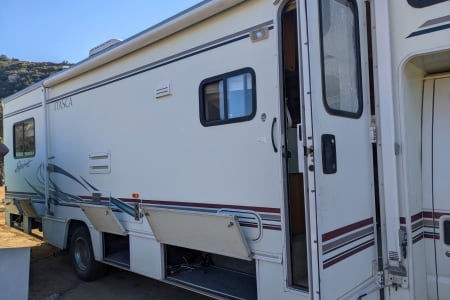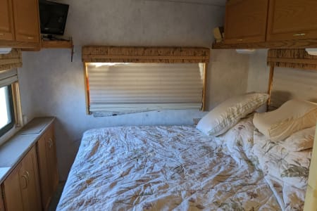 31' class C RV with large slide out. Shower & bathroom. Bedroom with queen bed in the rear Large bunk over the cab Dinette (folds to bed) Couch (folds to bed) Ac & heat(gas/elec) Stove/oven Microwave TV&DVD player Lots of outside storage