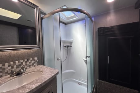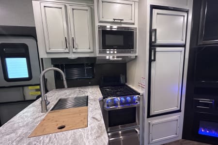 You'll walk into a beautiful living room with plenty of seating to relax and an entertainment center to watch your favorite games or movies. Inside the living room are two comfortable recliners with heating and massage options. Also, Bluetooth speakers for inside and outside the camper to enjoy your favorite music and fireplace for those cool nights. The kitchen is fully equipped with modern appliances and all the cooking supplies you'll need. A dinette that seats 4 which can also be converted into a bed.